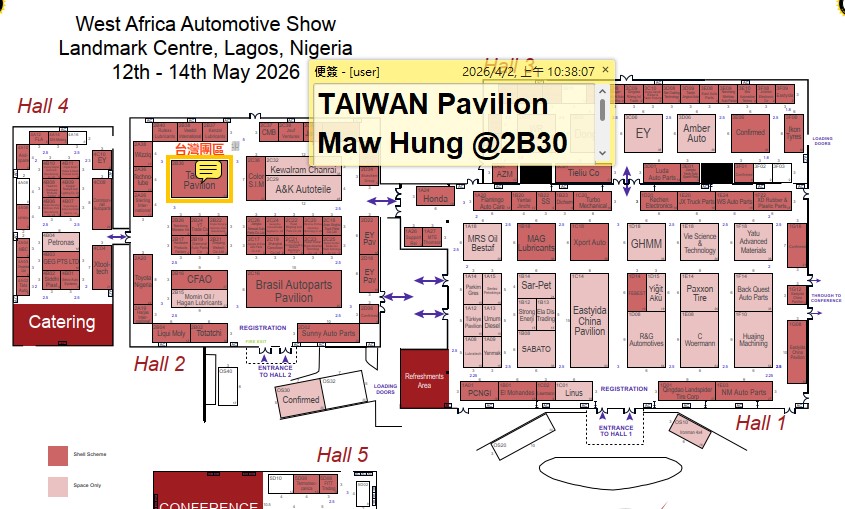 [LAGOS, NIGERIA – April 2, 2026] Maw Hung Industrial Co., Ltd., a premier manufacturer in the heavy-duty truck aftermarket, is proud to announce its participation in the 2026 West Africa Automotive Show (WAAS). Located at Booth 2B30 in the Taiwan Pavilion, Maw Hung will feature its latest range of high-durability Scania and Volvo truck parts. Designed to meet the rigorous demands of the African logistics sector, these components provide a strategic balance of OEM-level quality and cost-efficiency for global buyers.
